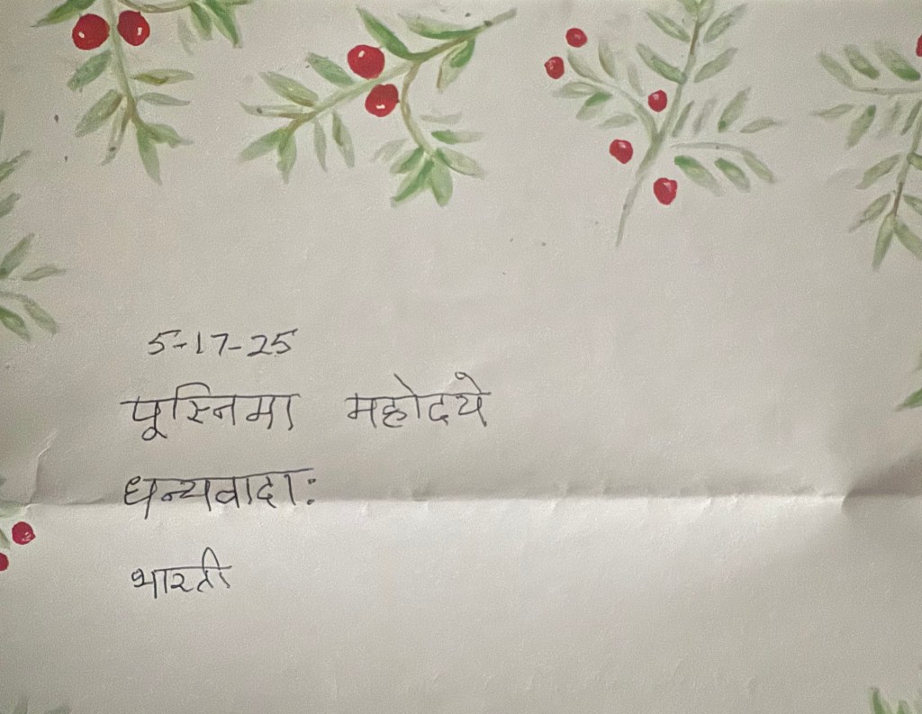 अत्र संस्कृतमातुः आशीरेव प्राप्ता मया इति भासते। पुरापि छात्राः पारितोषिकरूपेण किमपि अदुः परमस्मिन् संवत्सरे न जाने किमर्थम् I am getting emotional इदं प्राप्य। प्रायः जरायाः प्रभावः इति मन्ये। ;) पुष्पगुच्छस्तु मह्यं बहु रोचते तदपि पीतपाटलपुष्पस्य प्राप्तम् यस्य चित्रमधः। एवमेव स्वहस्तेन लिखितः सन्देशः – आ बहोः कालात् प्राप्ताः ईदृशः सन्देशाः सर्वे मम भित्तिमधुनापि अलङ्कुर्वन्ति। इदं नूत्नं सन्देशपत्रमपि तत्र योजयामि। एतादृशः व्यापारः घोरे संसारजीवने किञ्चित् कालं सुखं ददाति।