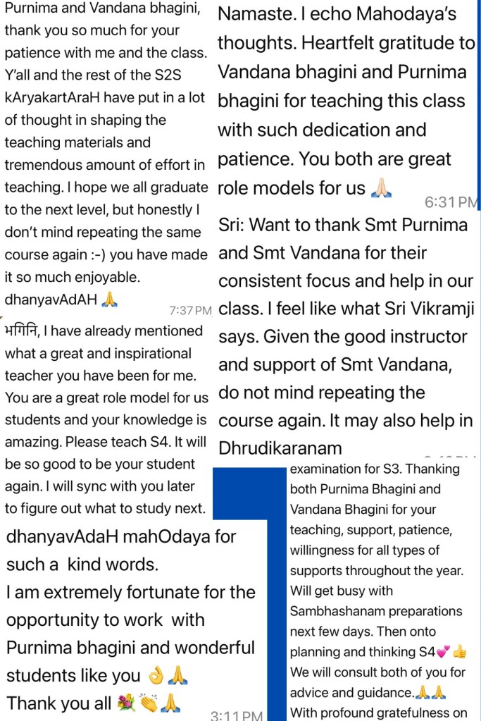 किं वदेयमद्य? नः केन्द्रे’द्य मम चतुर्थस्तरवर्गस्य अन्तिमदिनमस्य संवत्सरस्य यतोहि आगामिनि सप्ताहे दीर्घविरामकारणात् वर्गाः न भवन्ति तदनन्तरं वार्षिकोत्सवः (तदर्थं न गच्छेयम्)। अस्मिन् संवत्सरे भाग्यवशात् छात्राः संस्कृतपठने उत्सुकाः अपि च सदाचारज्ञाः। ममैव कुतूहलः आसीत् इमान् पाठयितुम्। अनेके प्रश्नाः, अन्यभाषया सह तोलनम्, ज्ञानार्जने आसक्तिः, परस्परादरः इत्यादयः मुख्यतया – light-hearted conversations इति वदेम खलु आङ्गले। इमान् पाठयित्वा तत्र तृप्तिरासीत् मम। अग्रिमे संवत्सरे’पि इमानेव पाठयामि चेत् ममापि सन्तोषः भवेत्।